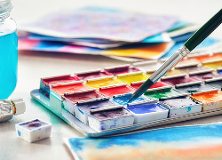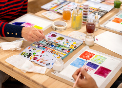 Try a one-day workshop first to build confidence before committing to a multi-week course. Then, start with a basic kit depending on whether you’re trying watercolors or acrylics. For watercolors, you’ll need a paint set of 12 colors, a few round brushes in sizes 6 through 10, a watercolor paper pad, painter’s tape and a palette. For acrylics, you’ll need an acrylic starter set, one flat brush and one round brush, a canvas panel or mixed media pad and a plastic palette.